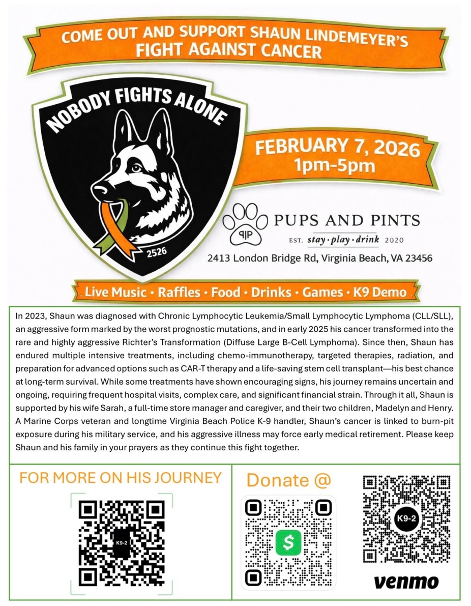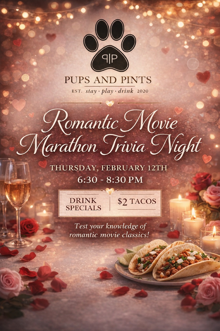 Nobody fights alone. Join us February 7th from 1–5 PM at Pups & Pints as we raise funds and support for Shaun, a Virginia Beach Police K-9 handler and Marine Corps veteran currently fighting cancer. This fundraiser is about more than money—it’s about community, love, and standing behind a man who has spent his life protecting others. Come out for live music, raffles, food, drinks, games, and a K-9 demo, and help us lift Shaun and his family during this difficult journey. Local businesses or individuals interested in donating items or services for our raffle are encouraged to reach out. Please contact us directly or email info@pupsandpints.dog to get involved. If you can’t attend, please consider donating or sharing this post. Every act of support truly matters. #NobodyFightsAlone#SupportLocalHeroes#CommunityStrong#PupsAndPints#VBStrong#VirginiaBeach#FundraiserEvent#K9Strong#PoliceSupport#MilitarySupport#CancerSupport#SupportSmallBusiness#GiveBackRomantic Movie Marathon Themed Trivia Night