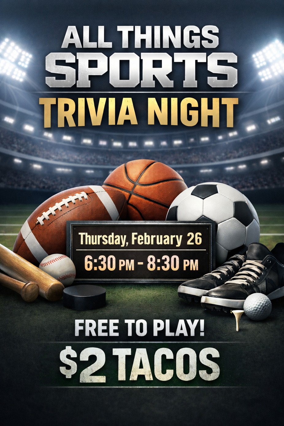 🏆 All Things Sports Trivia Because yelling at the TV wasn’t enough and now you want to prove something. 📅 Thursday, Feb 26 | 6:30–8:30 PM Free to play. $2 tacos. Incorrect answers will be judged silently. #SportsTriviaNight #TriviaWithAttitude #BarTrivia #ThursdayNightPlans #2DollarTacos #ProveItEnergy #DrinkThinkRepeat #VBEvents #VirginiaBeachNights #PupsAndPints #KnowItAllsWelcome 🍻