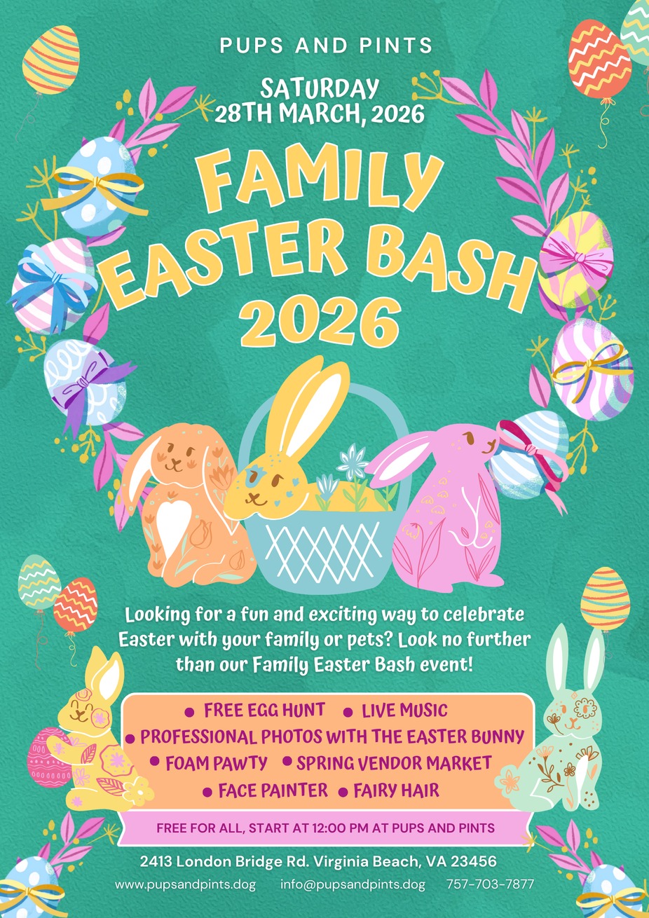 Warning: green beer will be flowing, outfits will get questionable, and things may get a little… foamy. St. Pawtrick’s Day is taking over Pups & Pints on March 14 from 12–4 PM We’re talking live music, green beer, gift card raffles, a best dressed competition, and a foam party that will absolutely test your life choices. Bring your friends. Bring your drinking stamina. Wear green or risk being judged. Dogs welcome — chaos encouraged. 2413 London Bridge Rd, Virginia Beach #PupsAndPints #StPawtricksDay #GreenBeerSeason #VirginiaBeachBars #DrinkLocalVB#VBEvents #LuckyVibes #DayDrinkingSeason #FoamPartyEnergy #BestDressedChaos#SipStayPlay #VBWeekendFamily Easter Bash