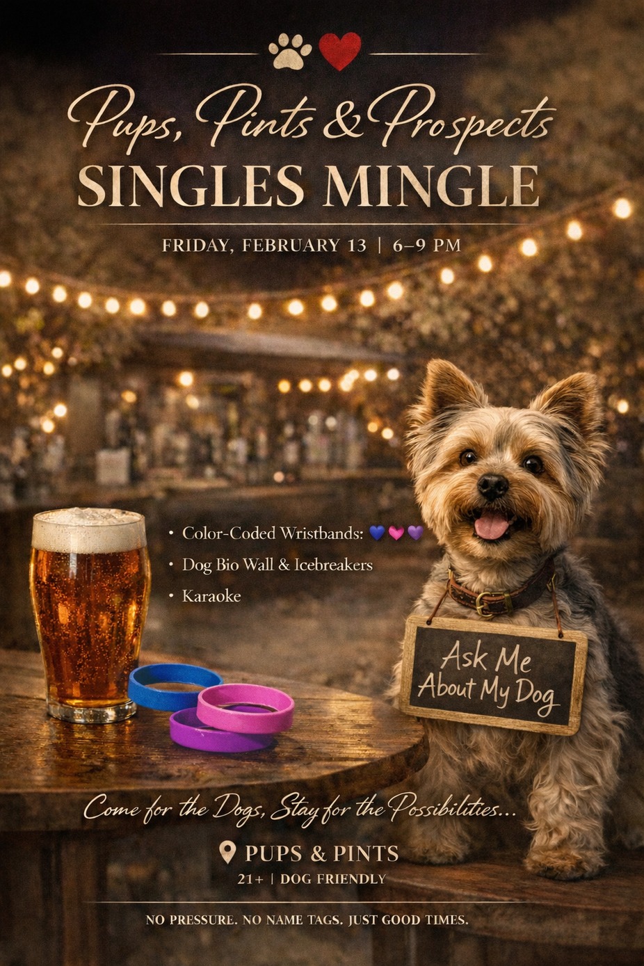 Join us Friday, February 13 for a Singles Mingle at Pups & Pints — a laid-back night to meet new people, pet some dogs, sip great drinks, and let things happen organically (or not at all, no pressure here). No speed dating. No awkward name tags. Just good vibes, good beer, and dogs doing what dogs do best… breaking the ice. We’ll have fun drink specials, easy icebreakers, and a crowd that’s here for the same thing you are — a good night out before Valentine’s Day. Come solo, come with friends, come with your pup. Worst case? You make a new dog friend. Best case? Well… you never know. Pups & Pints 6–9 PM Dog-friendly | 21+
